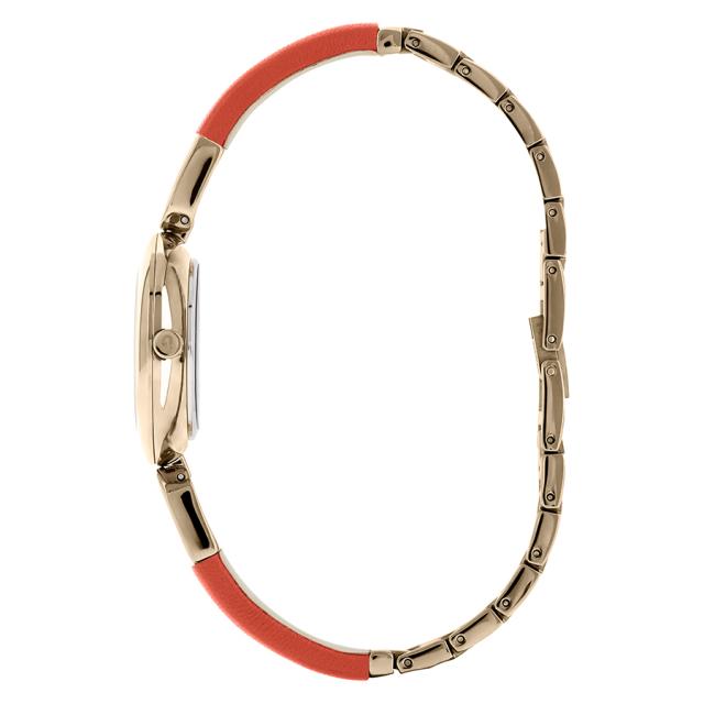 ソフトでカラフルなレザーに包まれた細身のブレスレットに、アーチロゴのメタルディテールを備えています。ラウンド型のダイヤルにはアイコニックなアーチロゴのパターンと小さなスタッズのインデックスがあしらわれています。