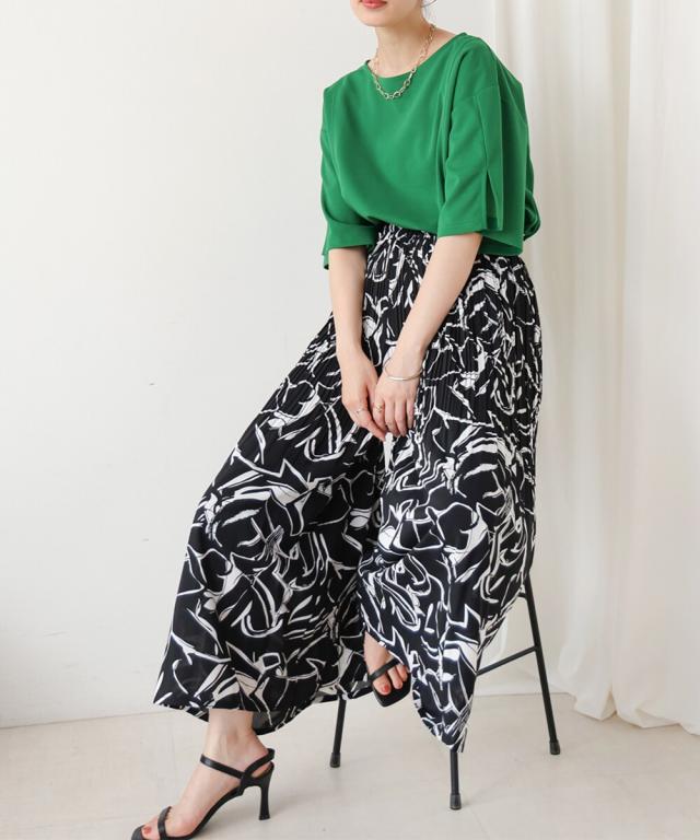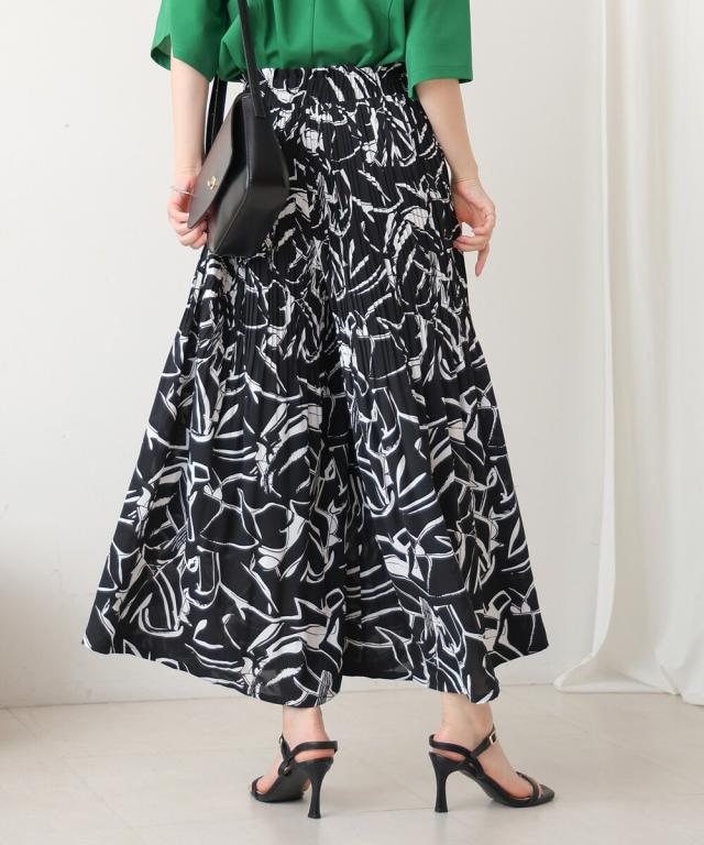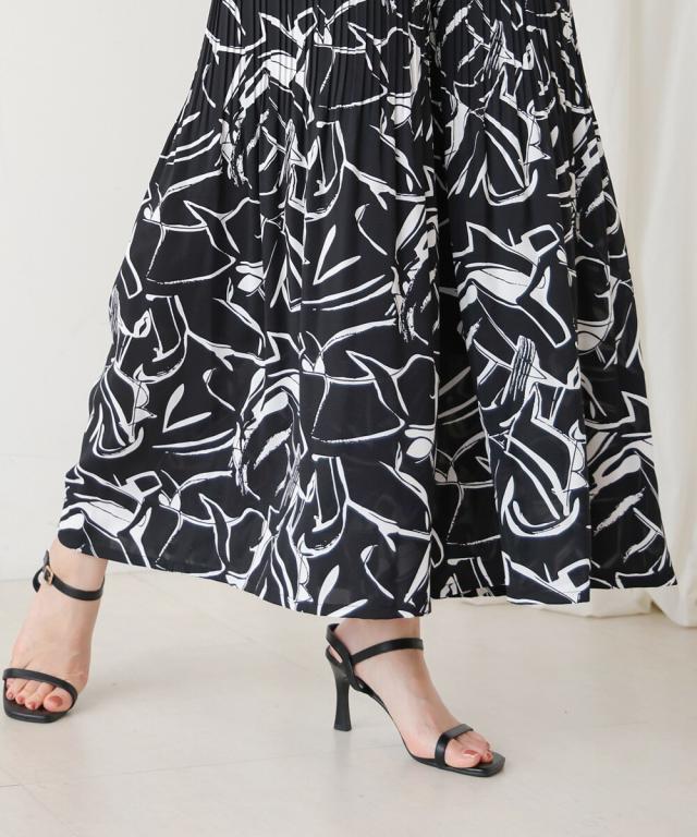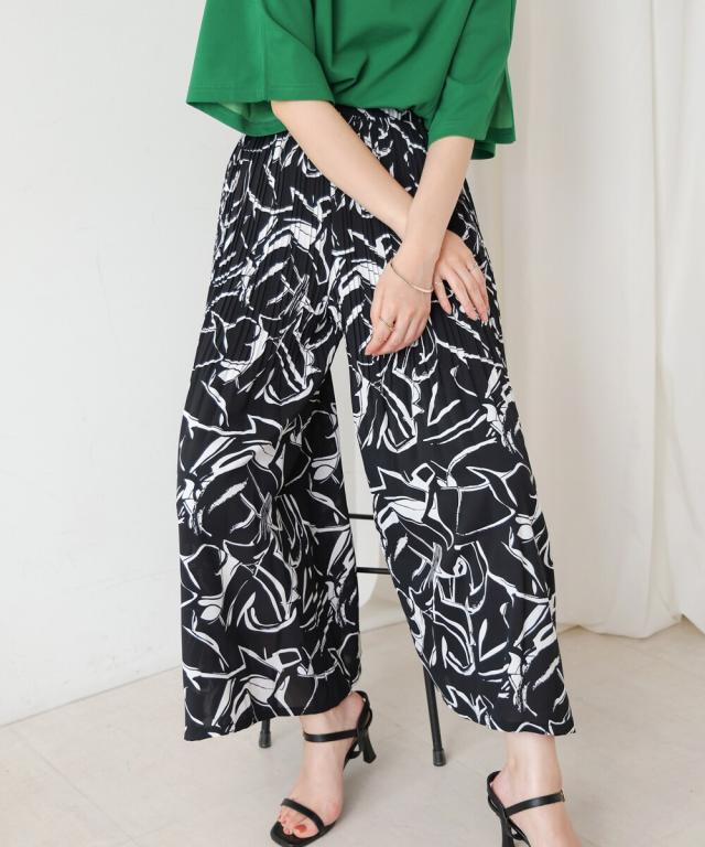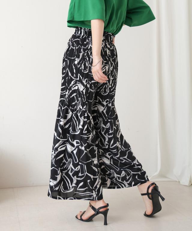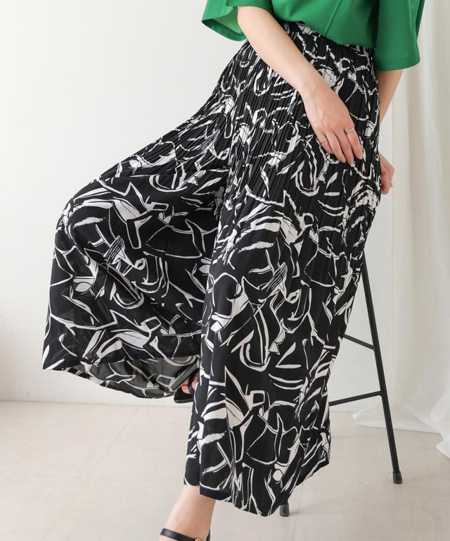 スカート見えするデザインで、動きやすさも叶えたワイドパンツ。上品なアート調のプリント地は2種類。オフホワイトは繊細なタッチの線柄、ブラックは大胆なアートタッチな柄になっています。繊細なプリーツを施すことで女性らしいエッセンスを加えてくれます。