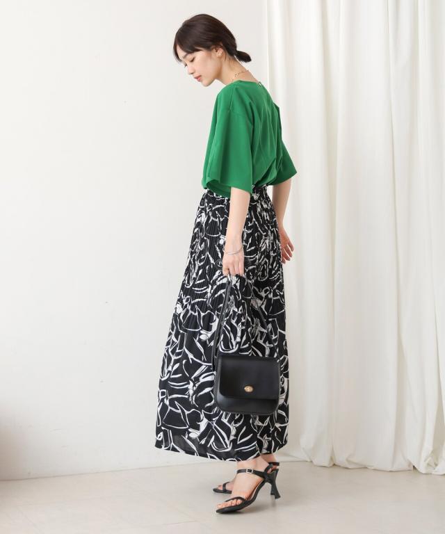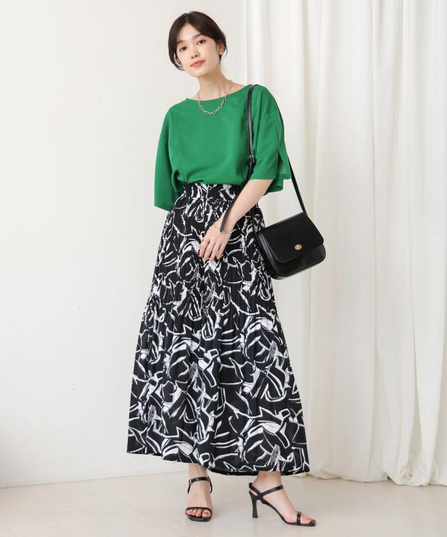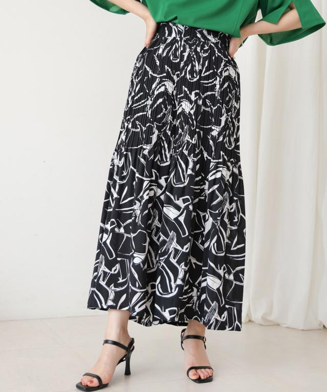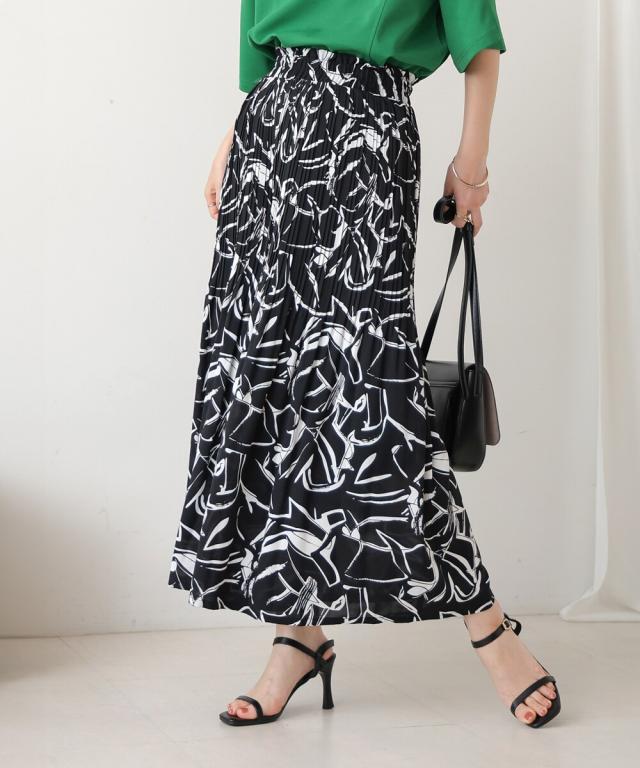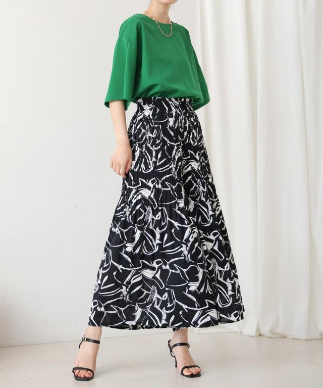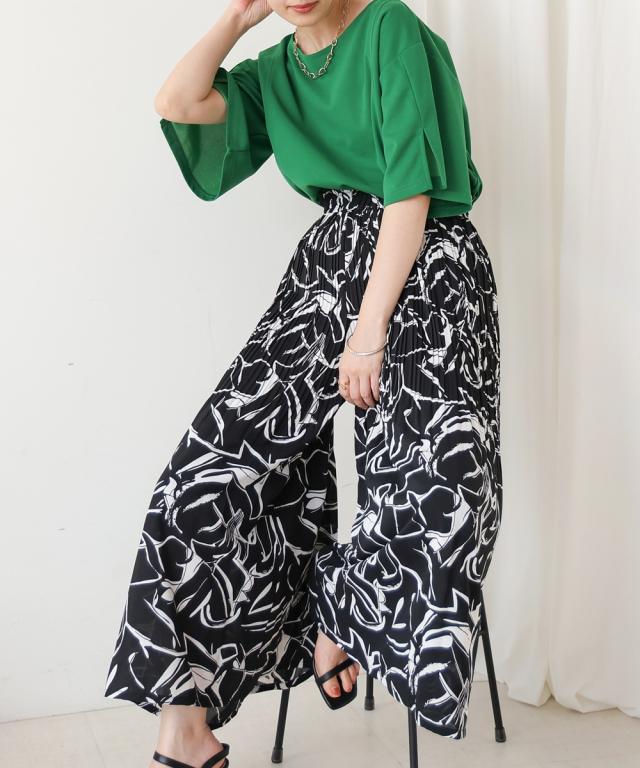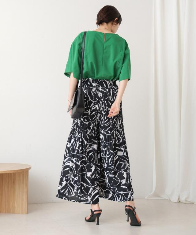 スカート見えするデザインで、動きやすさも叶えたワイドパンツ。上品なアート調のプリント地は2種類。オフホワイトは繊細なタッチの線柄、ブラックは大胆なアートタッチな柄になっています。繊細なプリーツを施すことで女性らしいエッセンスを加えてくれます。
