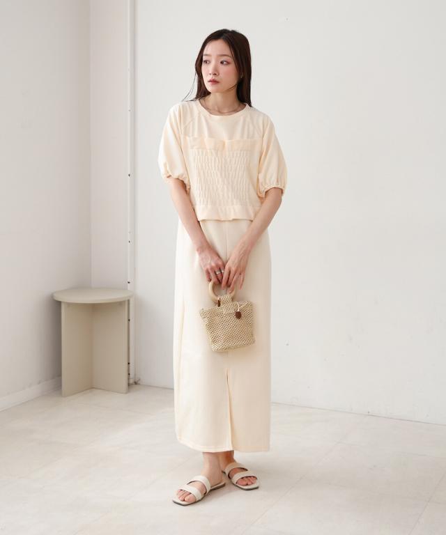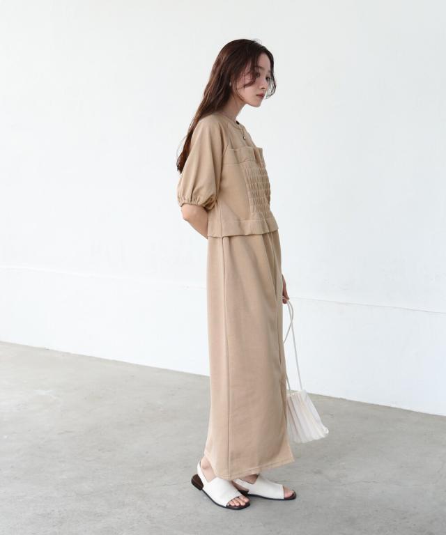 Sサイズを着用しました。くるぶしが隠れるくらいのロング丈になりました!センターのスリットが深く開いているので丈の長さはあまり気にならず、ビスチェ風デザインのおかげで視線が上がりバランスよく見えました!