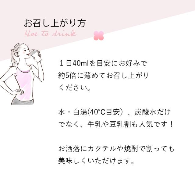 | お召し上がり方 | 1日あたり40mLを目安にお好みで約5倍程度に薄めてお召し上がりください。 【原液・お水以外のおすすめレシピ】 ★お洒落にカクテルや焼酎で割っても美味しく頂けます。 ★牛乳で希釈しても美味しい。豆乳割も海外で人気です。 |