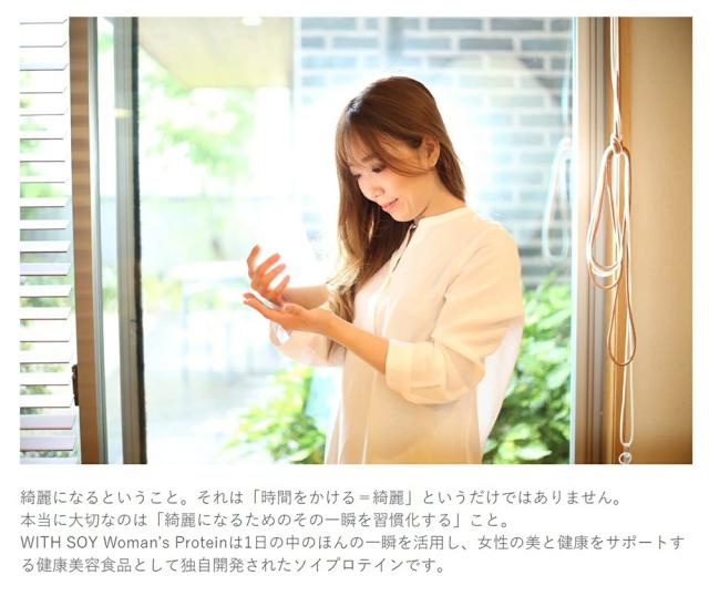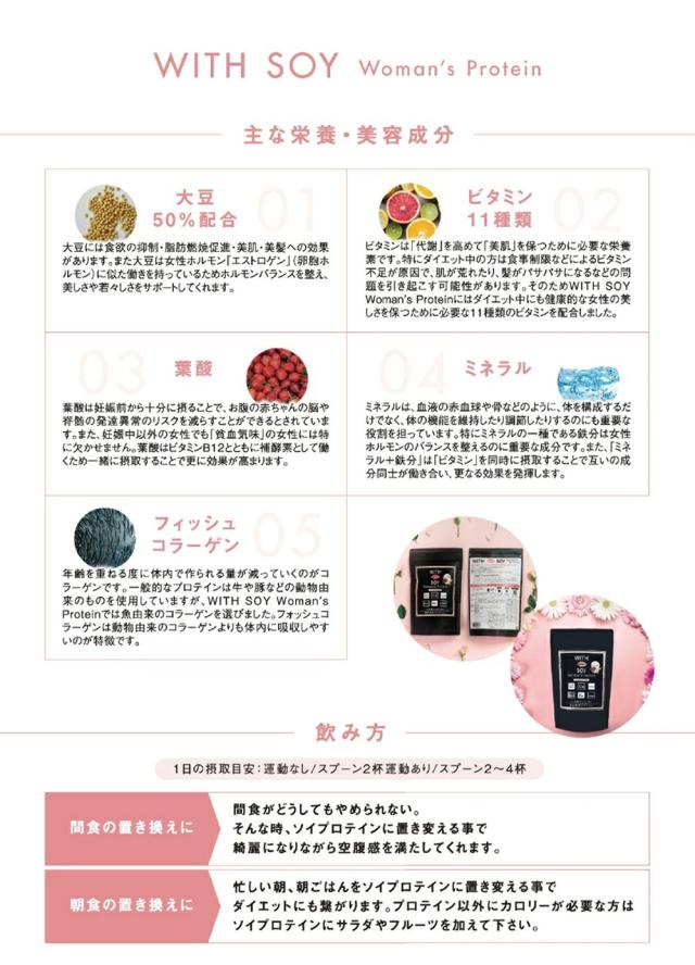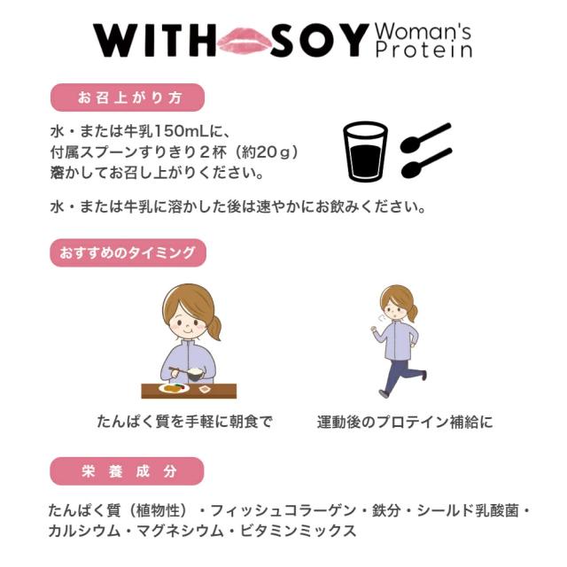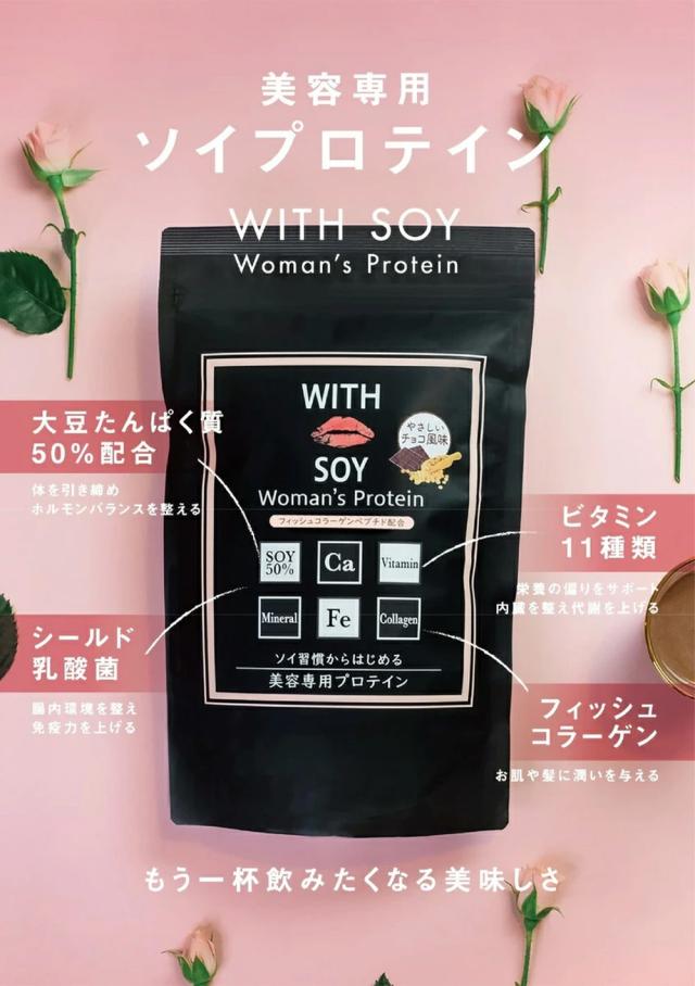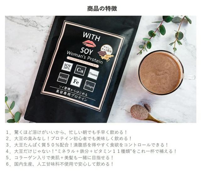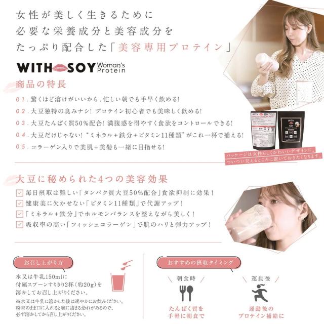 WITH SOY Woman's Protein は綺麗になりたい30代以上の女性に届けたい美容成分入りソイプロテインです。