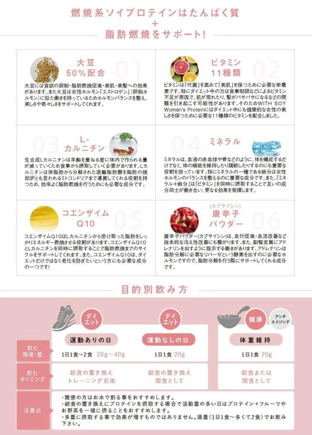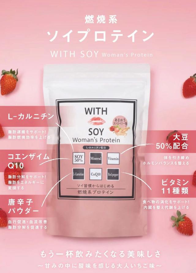 | 商品説明 | 大人気商品の2つの味がセットになって新登場! 【チョコレート味】不足した“女性ホルモン”を手軽に補充できる 「WITH SOY Woman's Protein 」 時間がない。でも綺麗になりたい! WITH SOY Woman's Protein は綺麗になりたい30代以上の女性に 届けたい美容成分入りソイプロテインです。 女性の美容成分入りのソイプロテイン ソイプロテインの原料である大豆には女性ホル モンと似た働きを持つ植物性エストロゲンが含 まれています。 またホルモンバランスを整える効果が期待でき、 年齢と共に不足してしまう女性ホルモンを手軽に補充することができます。 ビタミン+鉄分+フィッシュコラーゲンなど配合 キレイ作りに必要不可欠なビタミンやミネラル。 特に女性にとって大切な鉄分を配合しています。 鉄分が不足すると肌にハリがなくなり、シワの原因になることもあります。 またコラーゲンも配合されていて、女性らしいぷるっとしたもちもちお肌には 欠かせない成分になります。 続けやすさに、徹底的にこだわったソイプロテイン プロテインと聞くと、ダマになりやすい。粉っぽい。飲みにくい。 というイメージのある方が多いと思います。 WITH SOY BeautyProteinは粉っぽさもなくすぐ溶ける! また味は”もういっぱい飲みたくなる美味しさ”で、お子様にも美味しく飲んでいただけますのでプロテインに苦手意識のある女性に飲んでいただきたいです。 【あまおう(ストロベリー味】毎日の1杯で理想の"美ボディ"目指しませんか? 女性ならではの美しいボディを目指すために欠かせない、大豆たんぱく 50%配合。 WITH SOY Woman's Protein は時間がない、でも美ボディを目指したい! その願いを叶えるために作られた燃焼系プロテインです。 【健康的な美ボディを目指すため】 燃焼系成分のL-カルニチンとコエンザイムQ10に加え、唐辛子パウダーを配合。 大豆たんぱく質と、毎日の健康のために大切な栄養素を手軽に摂取できます。 (1)運動をする日は運動前後に飲むことをおすすめします。 (2)運動をしない日または、運動をしていない方はたんぱく質が不足しがちな朝食時に飲むことをおすすめします。 ■味 チョコレート味/あまおう(ストロベリー)味 |