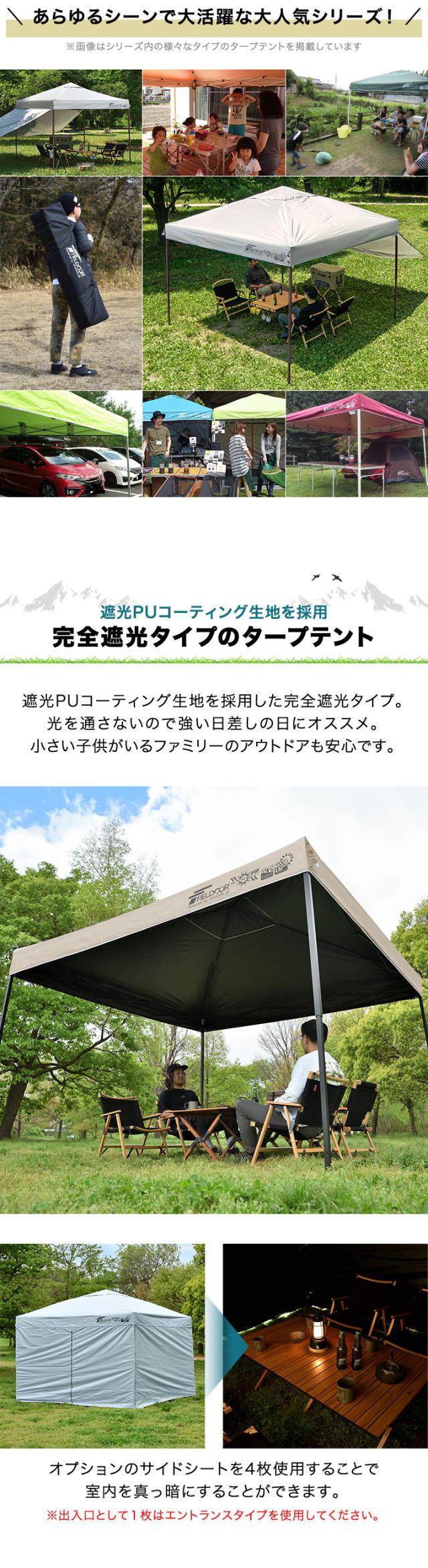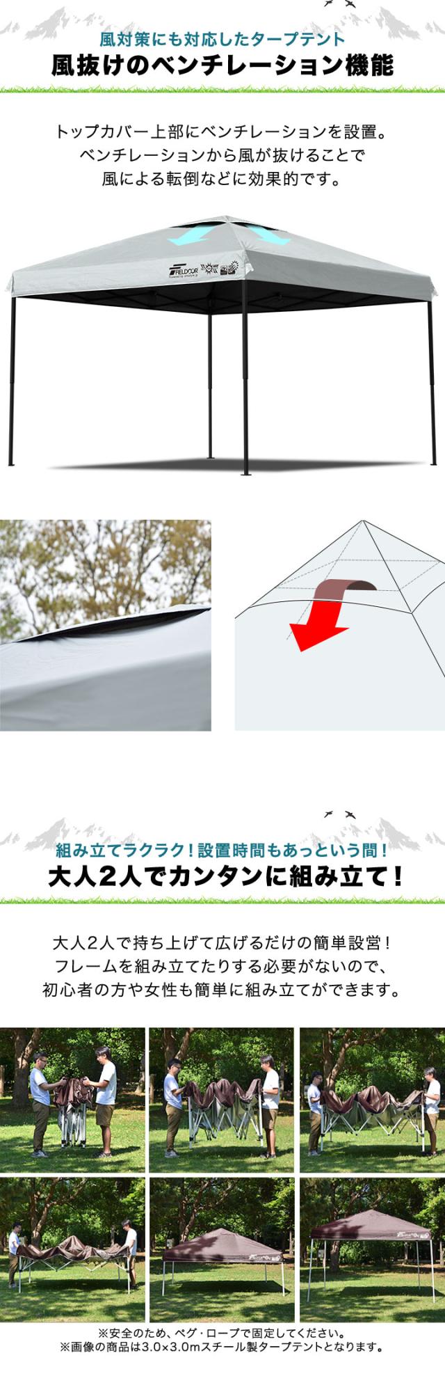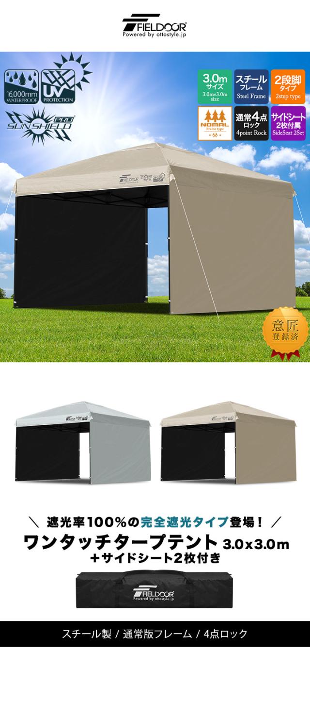 FIELDOOR タープテント 3m スチール UVカット/完全遮光100%/遮熱 PUコーティング サイドシート2枚付 横幕セット300 3.0m ワンタッチタープ 日よけ テント タープ ワンタッチテント ワンタッチタープテント アウトドア キャンプ 1年保証 送料無料