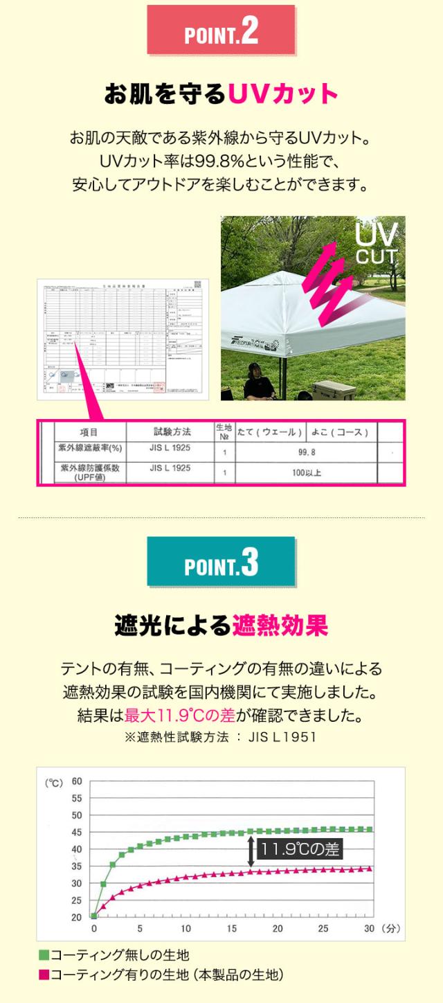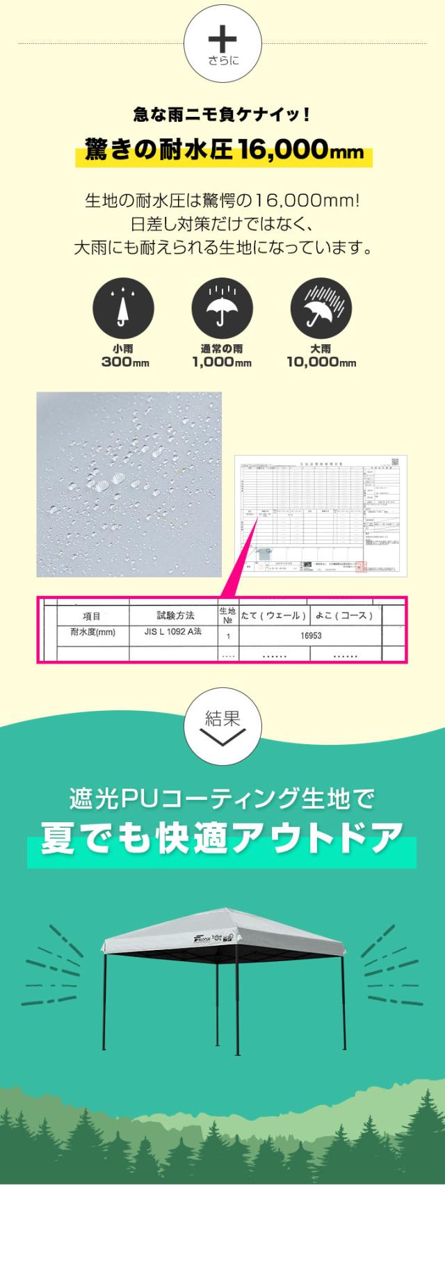 遮光PUコーティング生地を採用した完全遮光タイプ。光を通さないので強い日差しの日にオススメ。小さい子供がいるファミリーのアウトドアも安心です。