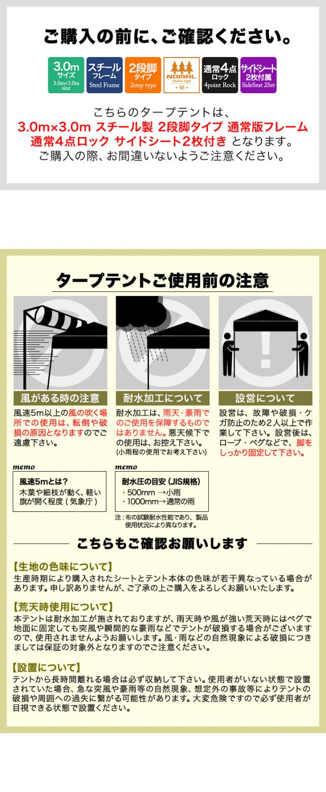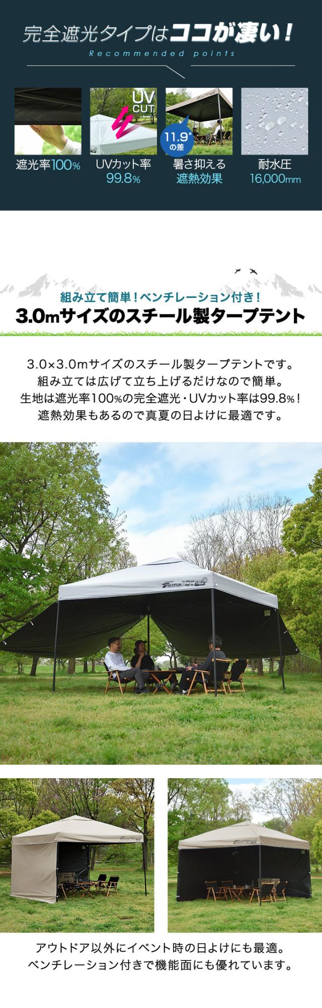 3.0×3.0mサイズのスチール製タープテントです。組み立ては広げて立ち上げるだけなので簡単。生地は遮光率100%の完全遮光・UVカット率は99.8%!遮熱効果もあるので真夏の日よけに最適です。