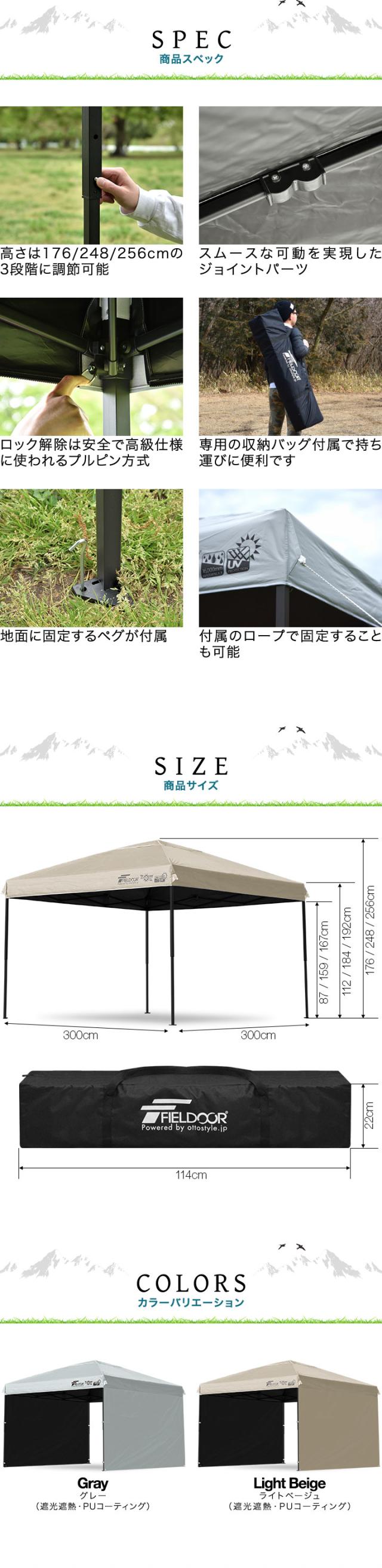 | サイズ: 組立時 : (約)3.0m×3.0m×1.76m / 2.48m / 2.56m 収納時 : (約)22cm×22cm×114cm |