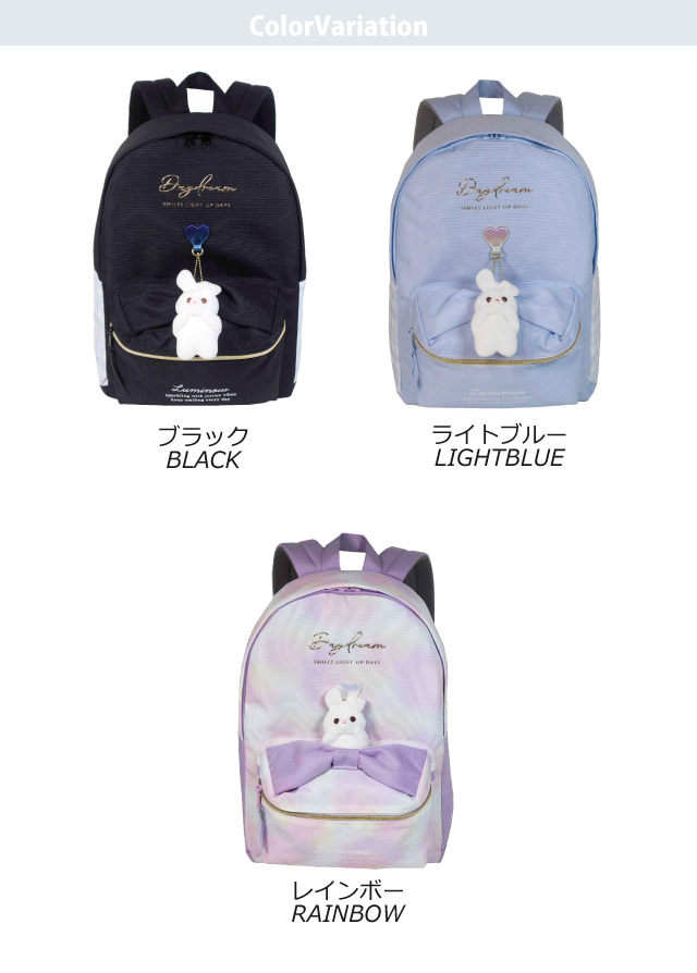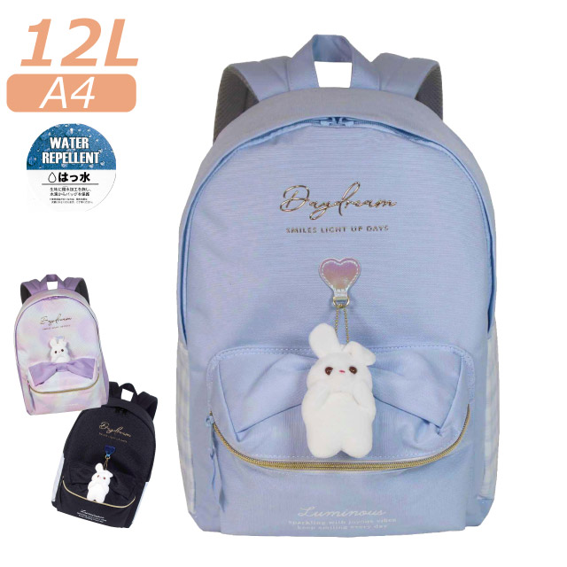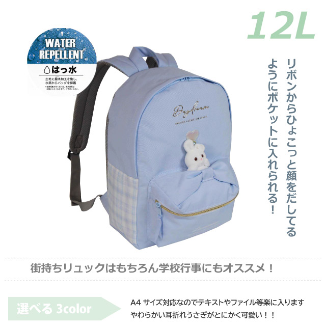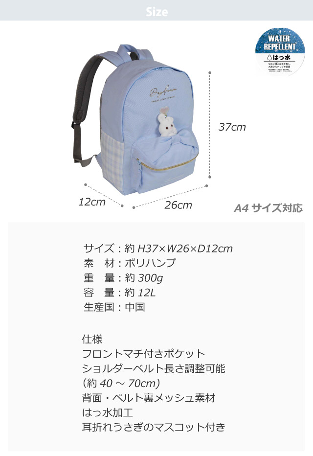 ■イメージ:おしゃれ かわいい お洒落 おすすめ 人気 通販 可愛い ガール girl a4ファイル a4サイズ収納 うさぎのキーホルダー付き 通学リュック パステルカラー チェック リボン りぼん パール 黒 ブラック 水色 ブルー うさぎ ウサギ ラビットグッズ 誕生日プレゼント クリスマスプレゼント 撥水 はっ水 サブバッグ 学童