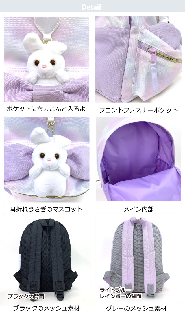 ![]() ![]() ![]() ![]() ・anilet+ アニレット ひょこぬいリボン フロントの大きなリボンから顔を出すうさちゃんがかわいいリュックサック。 小学生の女の子に人気です。 A4サイズ対応で収納力も抜群。 ちょっとした雨でも安心の撥水加工生地。 修学旅行・旅行・遠足・通園・通学・お出かけにおすすめ。br>