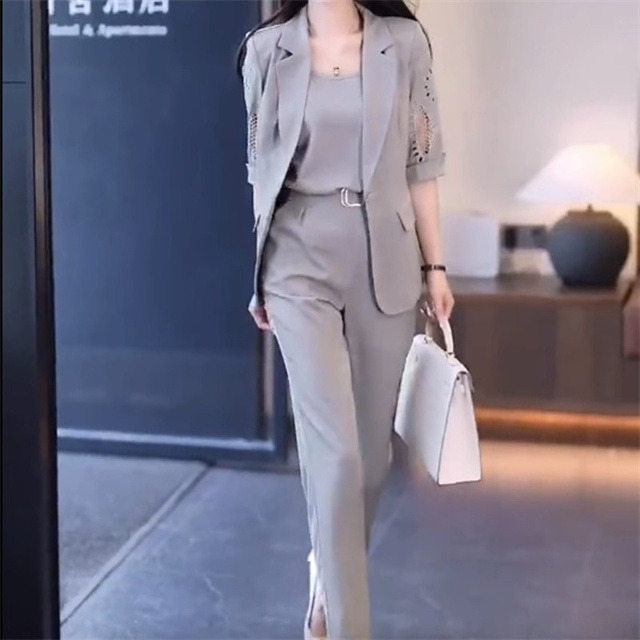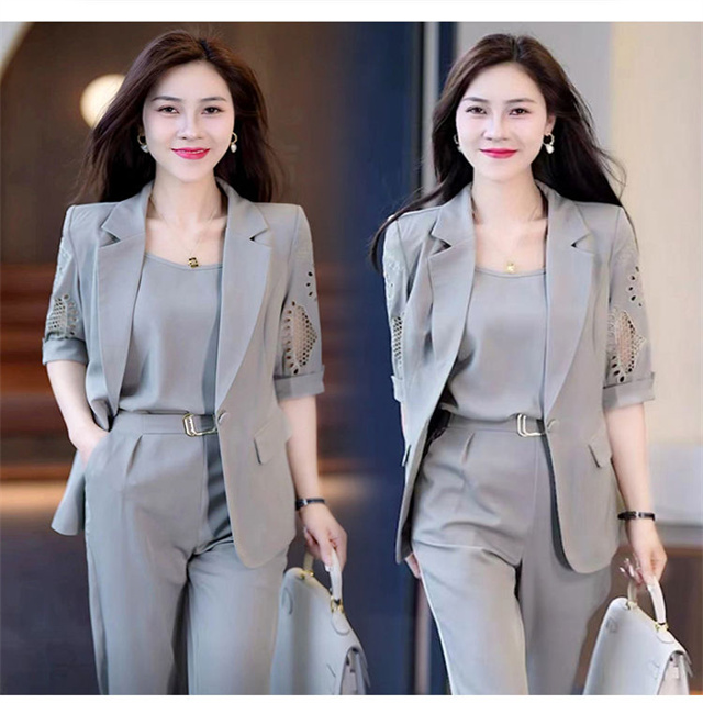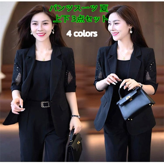 セットアップ レディース パンツスーツ 夏 ジャケット ブレザー 上下セット 3点セット スーツ 半袖 オフィス おしゃれ 体型カバー 着痩せ 安い 入学式 通勤