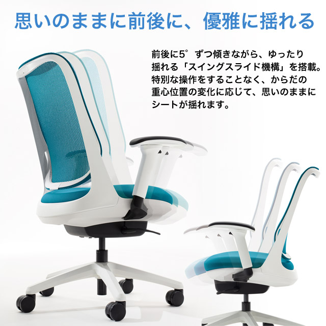 シート部の前後の揺れにより、集中作業時の「前傾姿勢」からリラックスしたり、アイデアを整理したいときの「後傾姿勢」まで自然な流れで姿勢の移行が可能。