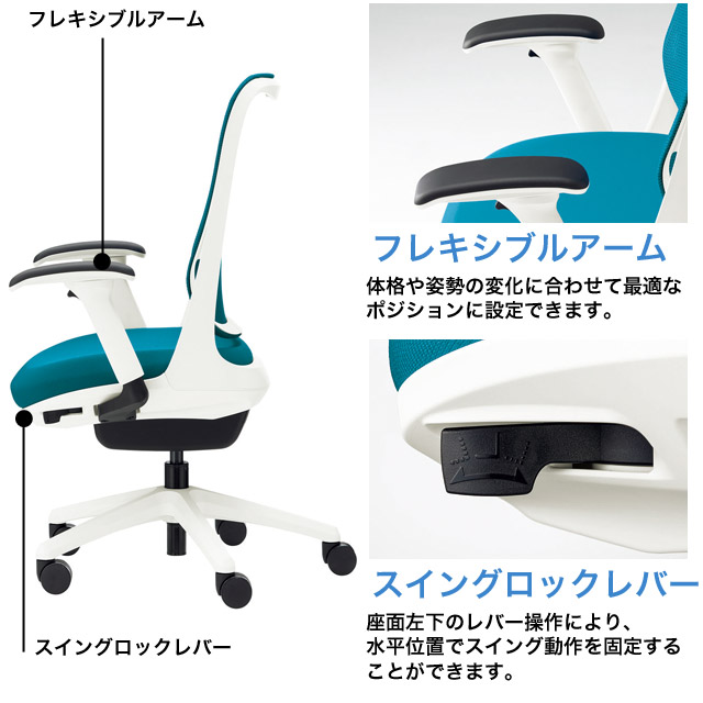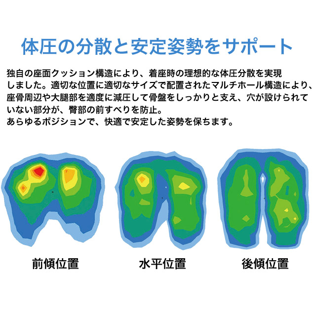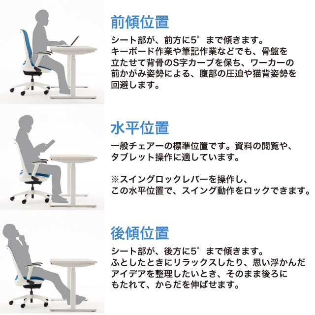 「負担の少ない正しい姿勢」をサポートします。水平位置(一般チェアーの標準位置)では、スイングロックレバーの操作により、前後の揺れをロックすることもできます。
