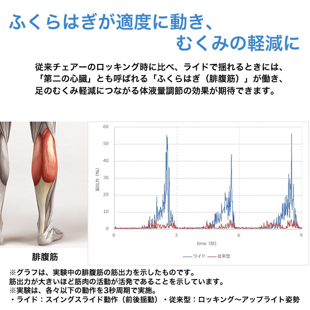 特別な操作をすることなく、からだの重心位置の変化に応じて、思いのままにシートが揺れます。