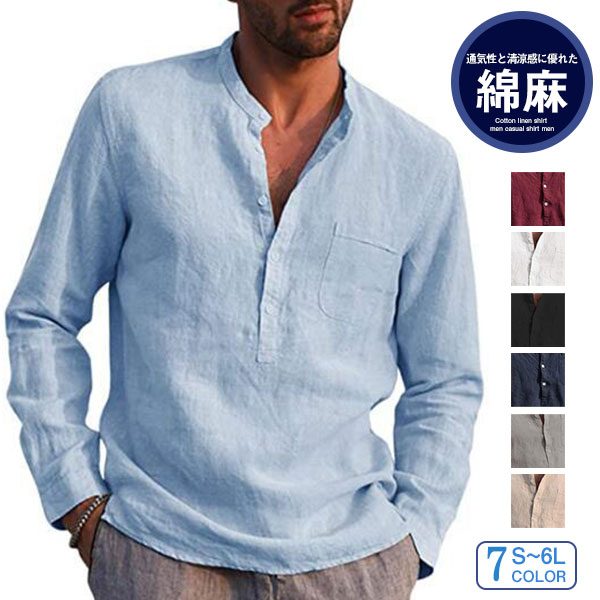 綿麻シャツ メンズ シャツ 長袖 スタンドカラー カジュアルシャツ 春夏秋トップス 開襟シャツ 胸ポケット付き 通勤 プルオーバー メンズファッション