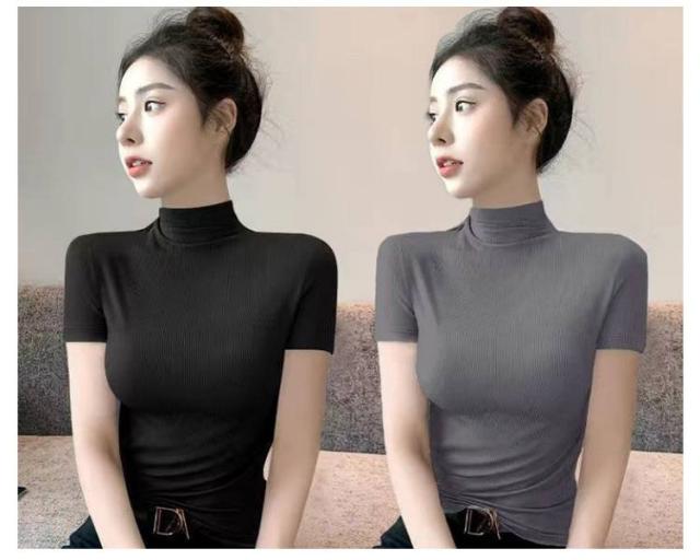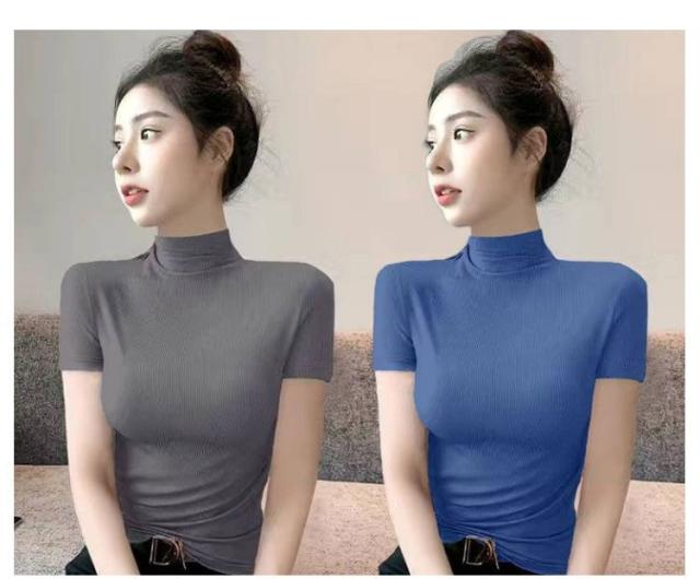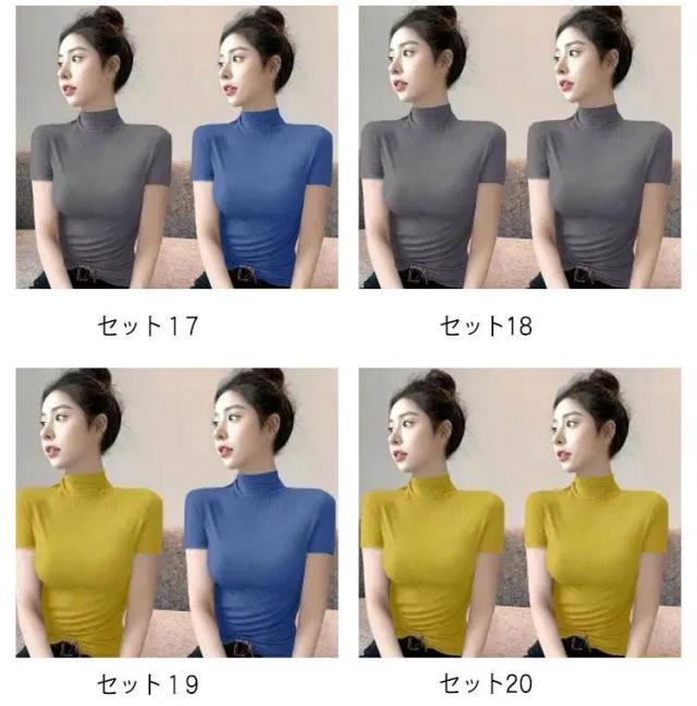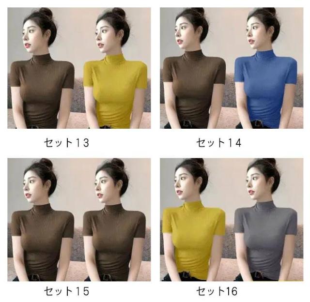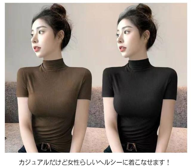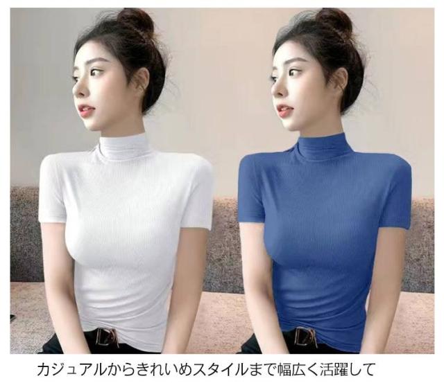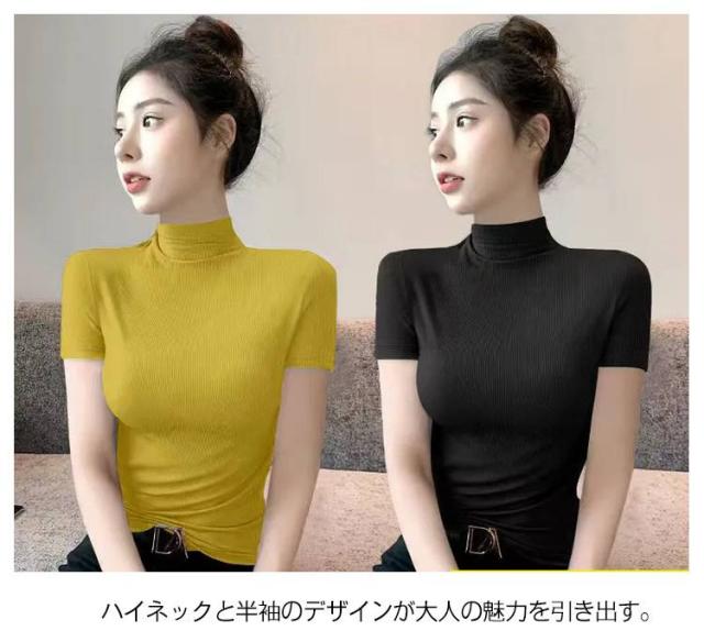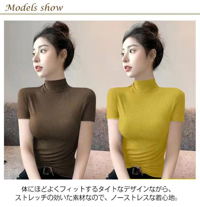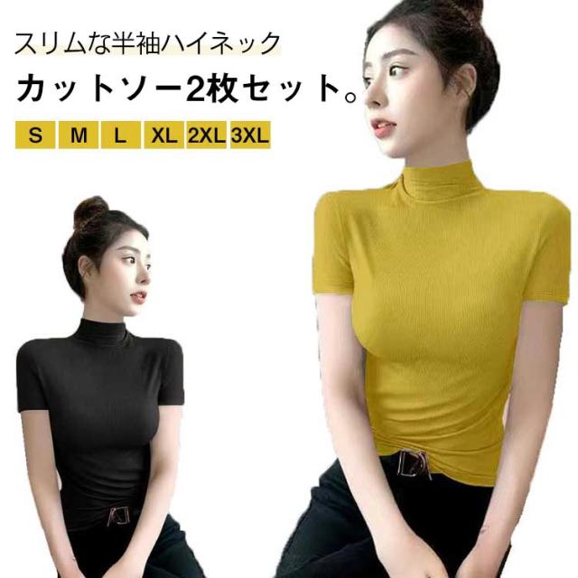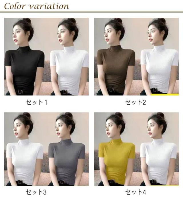 伸縮性 カットソー トップス tシャツ 秋 レディース 半袖 2枚セット!半袖カットソー インナー 無地 ストレッチ ハイネックカットソー おしゃれ 春 夏 ハイネック ハイネック