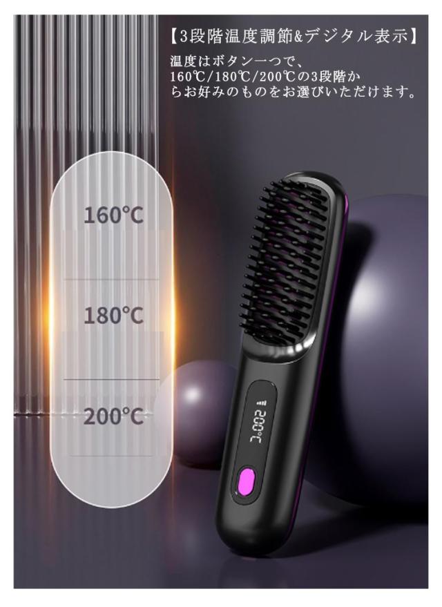 ヒートブラシ ストレートアイロン コードレス ミニ ヘアアイロン 充電式 ブラシ 温度3段階調節 ブラシ カールアイロン 160℃/180℃/200℃ 静電気防止 マイナスイオン USB ヒートブラシ 温度表示 大容量 旅行 携帯用 ポータブル 持ち運び