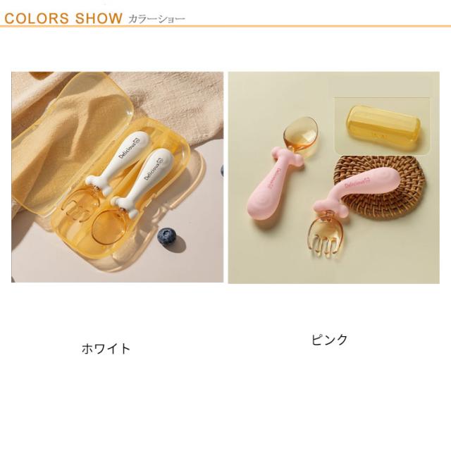 | 赤ちゃんからキッズまで握りやすいスプーンとフォーク、収納ケースの3点セット。 食用グレードシリコン製で赤ちゃんにも安心してご使用いただけます 口当たりの良い滑らかなスプーンは、子どものひと口に調度よい量をすくいあげられる大きさ◎ スプーン・フォークを使って食べることに慣れるための練習用にオススメです。 出産のお祝いにも喜ばれる事間違いなし! | |