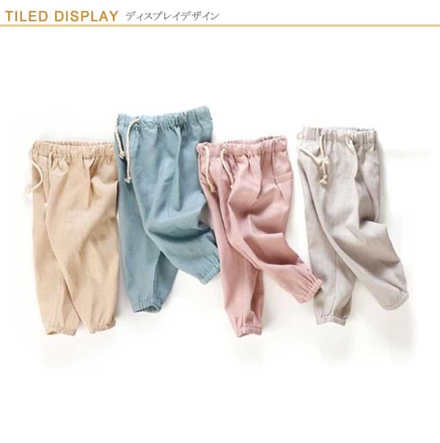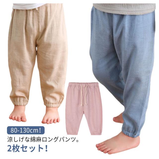 | 80-130cm!2枚セット!涼しげな綿麻ロングパンツ。 綿麻素材にゆったりとしたシルエットで春夏に最適な履き心地! 裾はゴム入りますので、真夏の蚊対策などにもぜひお薦めな1本です。 ウエストゴムで履き替えやすいです。 夏ファッションに大活躍の一枚です。 ルームウェアとしてもちろん、通園、通学やちょっとしたお出かけなど幅広く活用できシンプルなデザインなのでコーディネイトしやすくオシャレに着こなせます。 | |