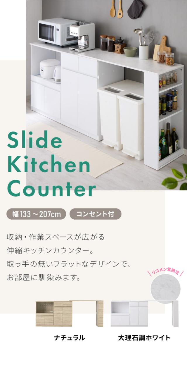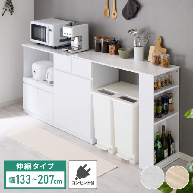 伸縮キッチンカウンター 2点セット 幅133~207 大理石調 フラット 2口コンセント スライド棚 引出し 扉収納 キッチン収納 キャビネット 食器棚 レンジ台 レンジボード ごみ箱上ラック(代引不可)【送料無料】