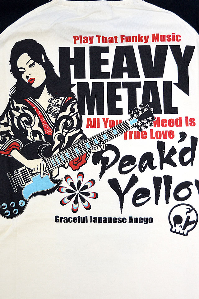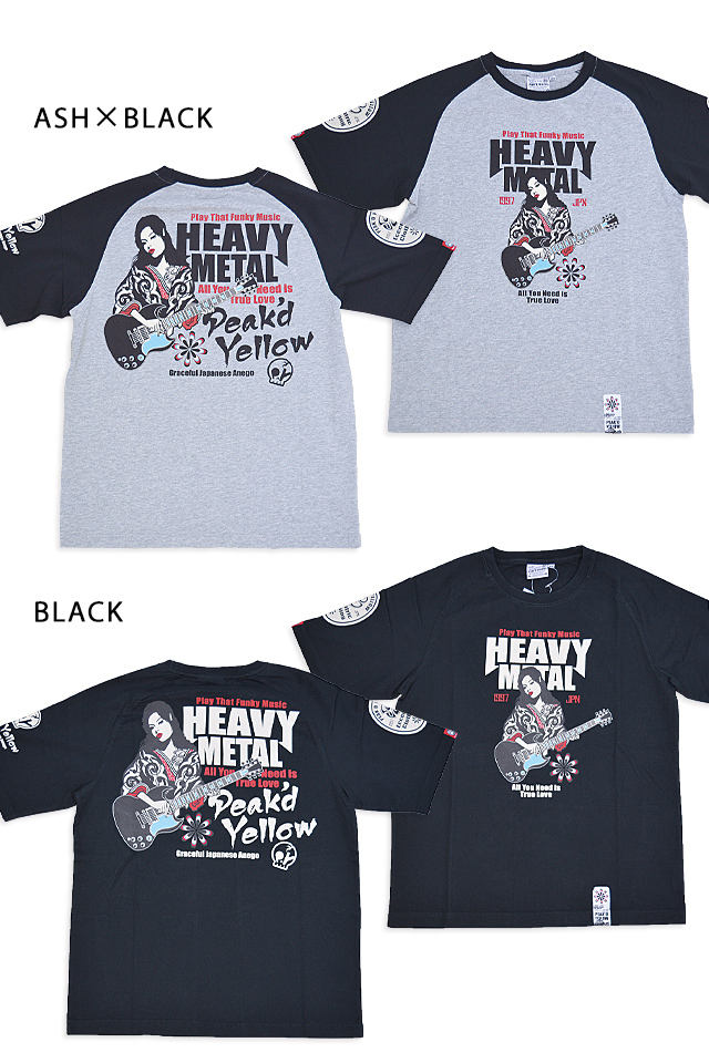 「トンガった日本人」をブランドネーミングに掲げ、オリエンタルビューティーの世界観を作品に封じ込めるピークドイエローから「ヘビーメタル半袖Tシャツ(PYT-241)」のご紹介です! ピークドイエローでは定番の姉御とギターのデザイン。 ヘビメタ好きの方にオススメな一枚です。 生地はストレッチのきいた、さらりとしたものを使用。 また、今回は肩の切り替えのないラグランボディーを採用し、スポーティーに仕上げました。 | ||||||||||||||||||||