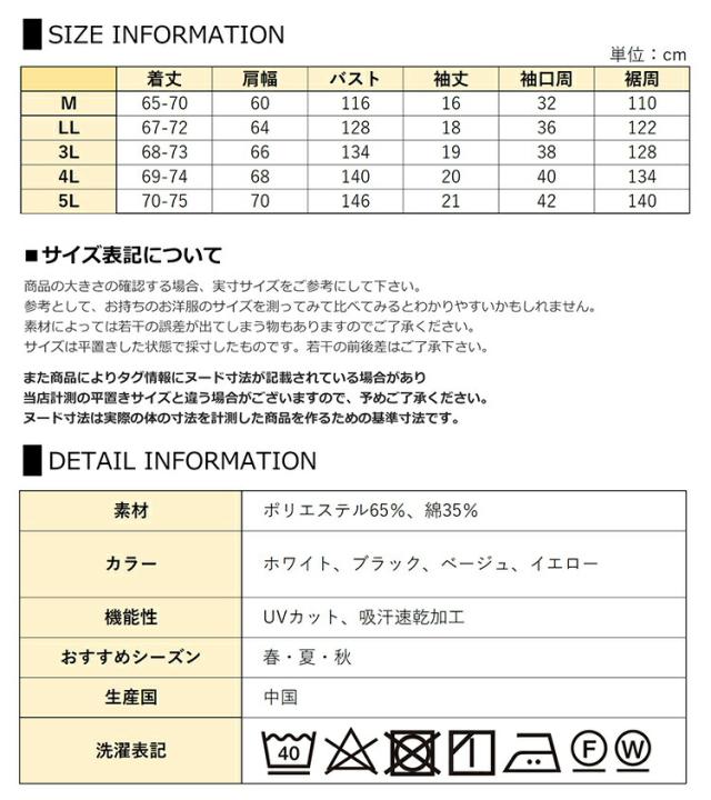 5L:着丈70-75 肩幅70 バスト146 袖丈21 袖口周42 裾周140