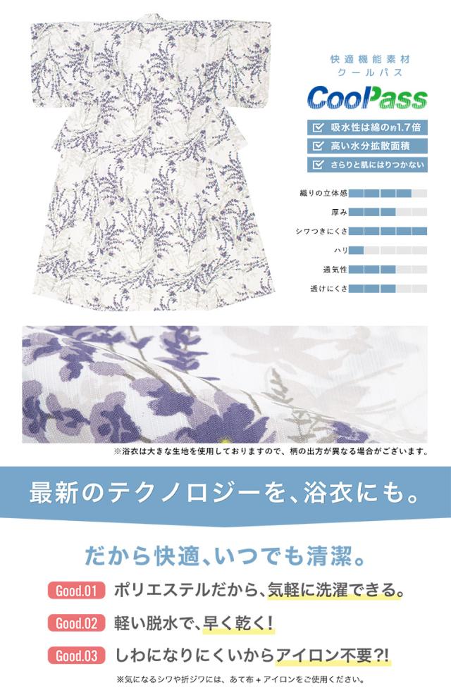 新作コーデ!内容は【浴衣・帯・下駄】のレディース浴衣3点セットです。浴衣生地は、ひんやりとした肌触りのポリエステル素材で、吸汗性と速乾性の繊維のCoolPassを使用しています。帯はポリエステル100%です。仕立て上がりですので、お届け後すぐにお召しいただけます。