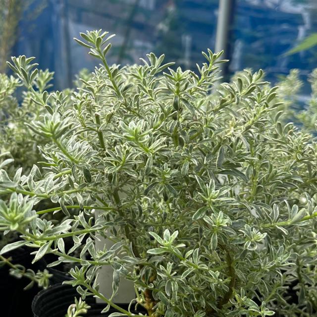 銀緑の葉にローズマリーのような花。ローメンテな常緑低木!