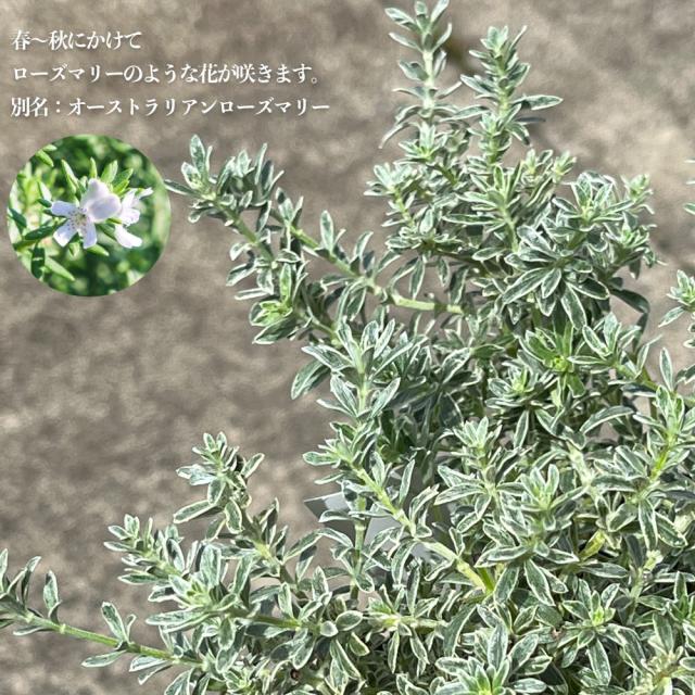 ローズマリーに似た葉や花を咲かせることから「オーストラリアンローズマリー」という通称でも親しまれています。ローズマリーより葉が細かくて茎も柔らかく、ふんわりした樹形が魅力です。香りはありません。乾燥に強く丈夫で剪定もしやすい上に春と秋に二度花を咲かせます。(原産地では長期間咲くようです)樹木の下草にはぴったりの低木です。