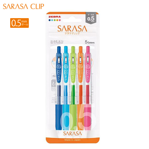 ゼブラ サラサクリップ 0.5mm 5色セット JJ15-5C-N コバルトブルー / ライトブルー / ライトグリーン / オレンジ / ピンク ジェルインク 水性顔料 樹脂 ラバーグリップ付 バインダークリップ SARASA CLIP