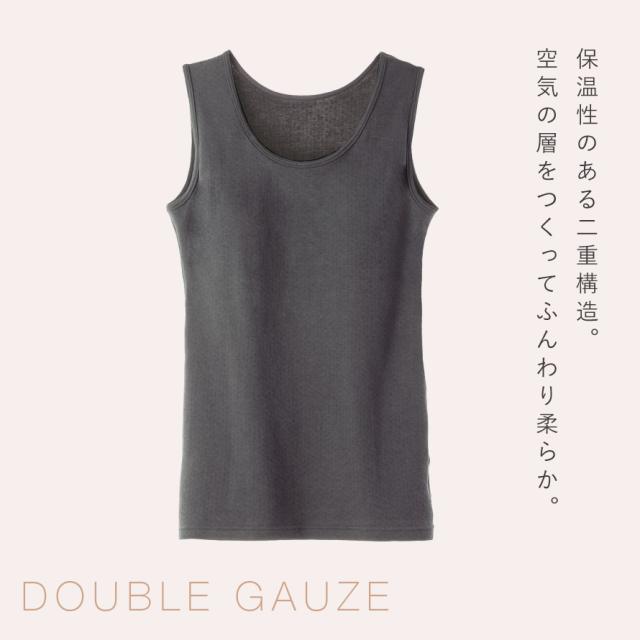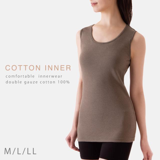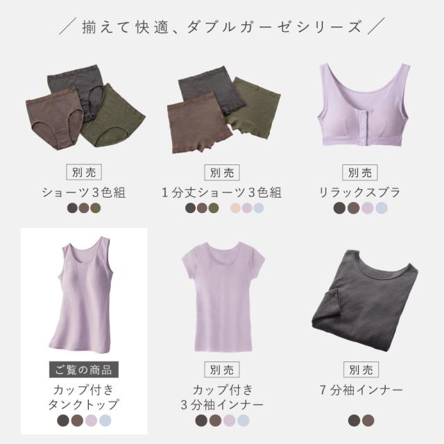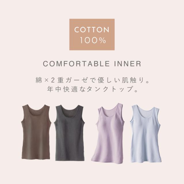 綿100%二重ガーゼで優しい肌触り。ふんわり柔らかいカップ付きタンクトップ。天然繊維の綿100%。肌触り優しく、化学繊維が苦手な方にもおすすめ。