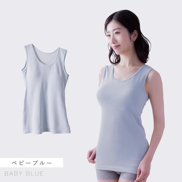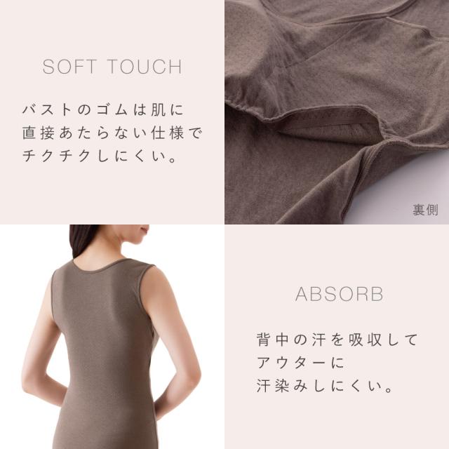背中もしっかりカバーし汗を吸収してアウターに汗染みしにくく◎。背中はガーゼ生地のみでアンダーゴムの段差がない為、バックスタイルもすっきり見せます。