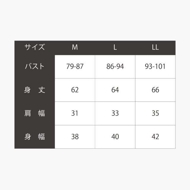 ■サイズ:M/バスト79-87、身丈62、肩幅31、身幅38、L/バスト86-94、身丈64、肩幅33、身幅40、LL/バスト93-101、身丈66、肩幅35、身幅42cm