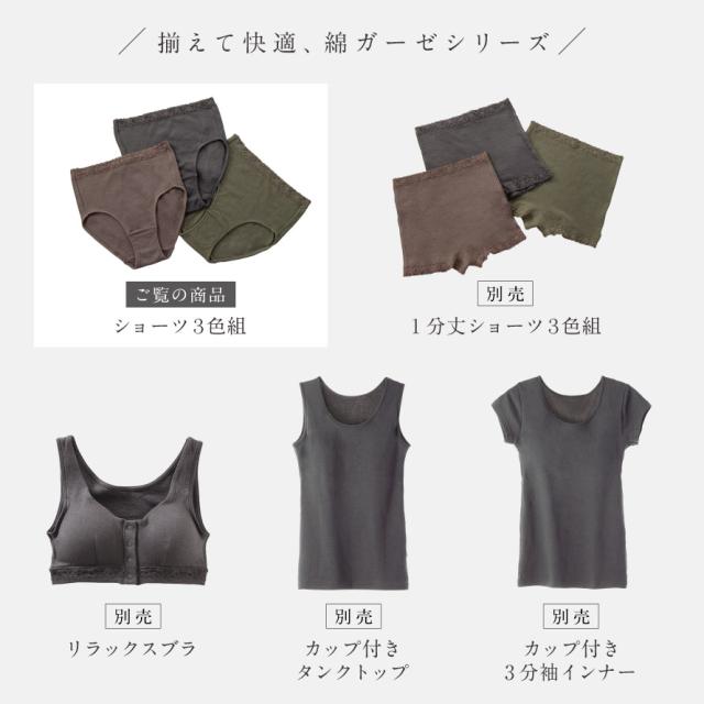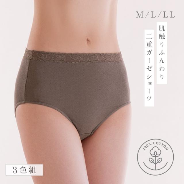 ショーツ 綿100% レディース,ショーツ 3枚組,ショーツ セット,ショーツ,パンツ,セット,3枚組,下着,締めつけない,ガーゼ,二重ガーゼ,ダブルガーゼ,天然繊維,寝冷え,冷房対策,冷え対策,冷え性,吸汗,ブラウン,茶色,チャコールグレー,グレー,グリーン,緑,カーキ,オリーブグリーン,綿100%,コットン100%,綿,コットン,100,肌に優しい,敏感肌,やわらかい,柔らかい,春,夏,秋,冬,オールシーズン,大人,レディース,女性,シニア,高齢者,お年寄り,シンプル,M,L,LL,大きいサイズ,ゆったり,大きめ,