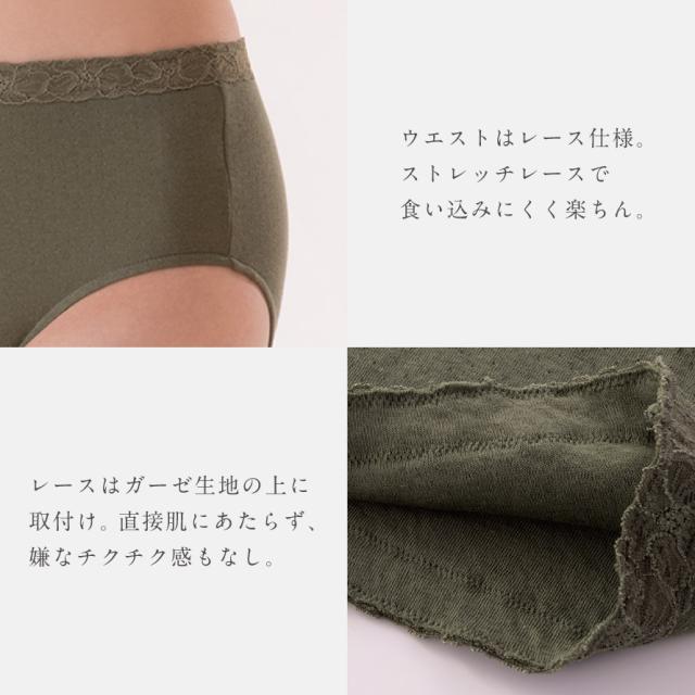 ウエストは可愛らしいレース仕様。レースはガーゼ生地の上に取り付けているので直接肌にあたらず、嫌なチクチク感もなし。お尻をすっぽり包み込み安定した着用感。