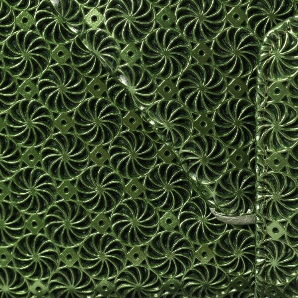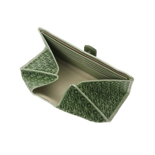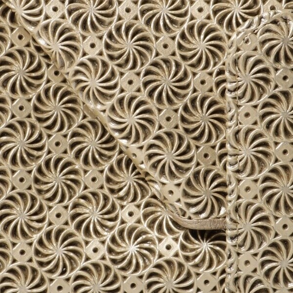 一見金網のように見える連続的な模様の素材は、メタリック加工をした牛革に、型押しと型抜きを同時に施しました。