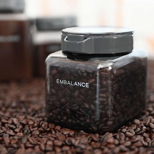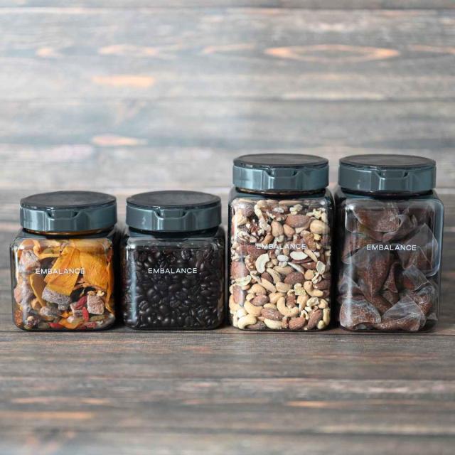 ワンタッチ開閉のコンテナです。調味料やお出汁パック、コーヒー豆、紅茶などの茶葉、シリアルなど食品を入れるのに丁度良いサイズです。エンバランス加工が施されているので、鮮度や風味を保つことができます。容器にブラックをカラーリングし、UVカット率79.6%の効果も持たせたので更に食品の劣化を防ぎます。同サイズやサイズ違いで揃えるとスタイリッシュな雰囲気を演出してくれます。