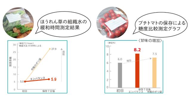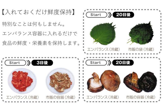 エンバランス加工の容器で保存することで、鮮度だけでなく野菜などの栄養素も保持します。余った食材やお料理などをおいしく保存、痛んで捨ててしまうことがなく食品ロスを減らせます。エンバランス加工の効果は、殺菌などにより鮮度を保持するのではなく、食品そのものを元気にさせるので安心してお使いいただけます。