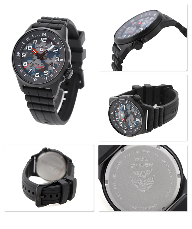 正規品 7年保証キャンペーン ケンテックス JSDF コンバットソーラー 空軍 日本製 メンズ 腕時計 S715M-17 Kentex JSDF Combat Solar アナログ カモフラージュ ブラック 黒 ◆Kentex(ケンテックス)から、自衛隊の迷彩服に同化する、戦闘仕様の「コンバットソーラー」が登場。文字盤デザインは各自衛隊の迷彩模様を忠実に再現。ケースは、腕の稼働を妨げない4時位置リューズに、太陽光の光が時計に反射して光ってしまう事のないよう、マットなオールブラックIP仕様。針は太めのドルフィン針をベースに、時分針の先端がレッドとグレーに色分けされている。ベルトは、陸・海・空、自衛隊を表す3本ラインをモチーフにデザインされた専用ラバーベルトを採用。ラバーベルトのケース連結部は、伸縮する波形状とすることで、手首へのフィット感がより高まる機能的な設計となっている。 発売日:2024年7月発売