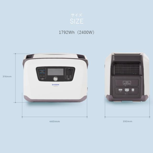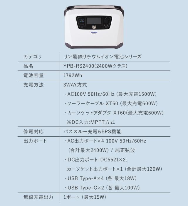 | 商品説明 | ●コンパクトなのに大容量 長寿命で安心して使えるポータブル電源 ●最速1時間50分以内の急速充電 ●リン酸鉄リチウムイオン電池使用 ●充放電サイクル3000回 ●パススルー充電&EPS機能 ●電池セルから電源設計まで工場にてトータル製造 ●ワイヤレス充電×1 ●安全機能:過電圧/過電流保護、過負荷保護、過放電保護、低温保護、高温保護、短絡保護、システムエラー保護 ●動作保護:-20℃〜40℃ 充電温度:0℃〜40℃ ●定格出力2400W ●バッテリー容量:1792Wh ●3way充電方式 AC充電ケーブル:AC100V 50/60Hz 最大充電1500W カーソケットアダプター:XT60 12-60V対応 最大充電600W ソーラーケーブル:XT60 最大充電600W ●出力 USB出力;Type-A 4口 各 最大18W (5V/3A,9V/2A,12V/1.5A) AC出力:100V 50/60Hz (4口 合計最大2400W) / 純正弦波 DC出力:12V / 10A (DC5521 2口,カーソケット出力ポート1口 合計最大120W) USB Type-C出力:Type-C 2口 各 最大100W (5V/3A,9V/3A,12V/3A,20V5A) 無線充電出力:最大15W |