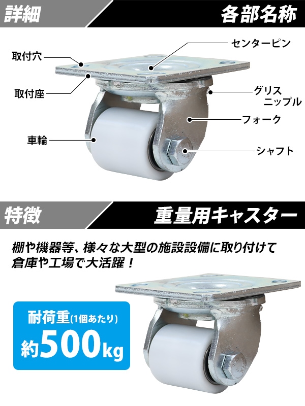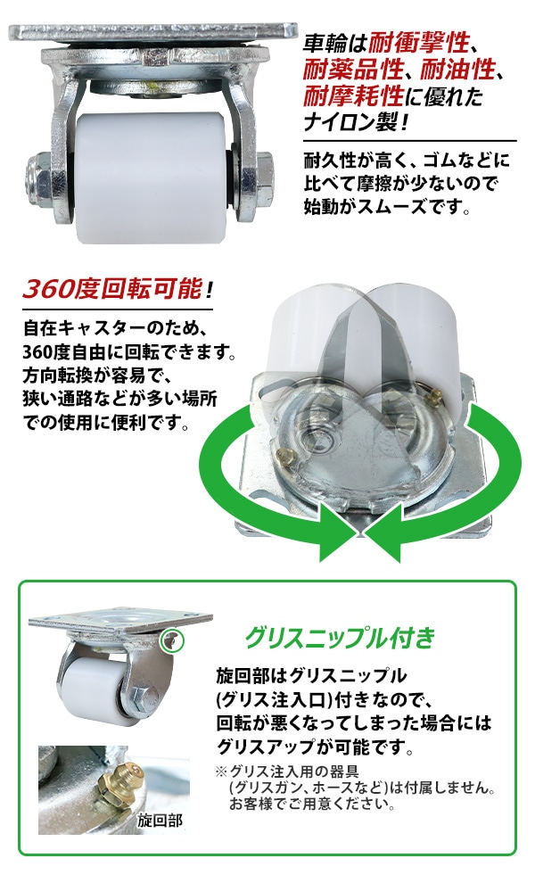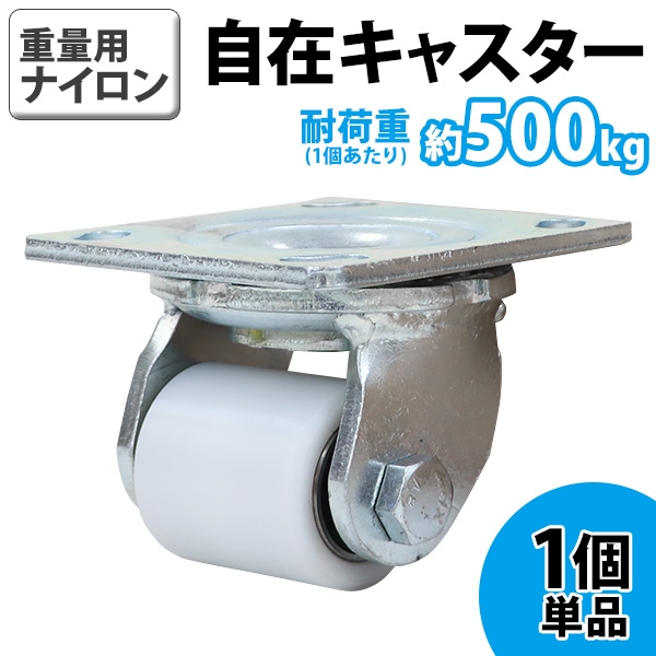 キャスター 自在キャスター 重量用 ナイロン製 1個 単品 重量用キャスター 耐荷重約500kg(1個あたり) 車輪直径約49mm 幅約54mm グリスニップル付き 自在車 ナイロン車輪 工場 倉庫 作業 運搬 cstrnyfrn501p
