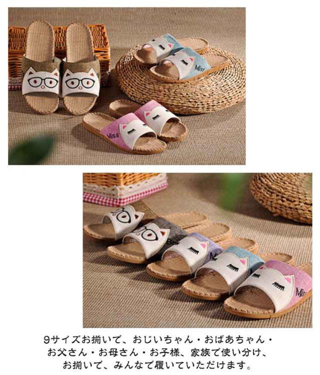 | 可愛く、夏を快適に過ごせる、ルームシューズです。 さらさらと通気性のいい麻を使用したスリッパで暑い季節にベタベタしにくいです。 9サイズお揃いで、おじいちゃん・おばあちゃん・お父さん・お母さん・お子様、家族で使い分け、お揃いで、みんなで履いていただけます。 室内で歩いてもうるさくなりにくい静音設計を施しているため足音が静かです。 見た目も可愛くおしゃれなデザインで、和風なお家、洋風なお家、両方の玄関どちらに置いてあっても違和感はありません。 | |