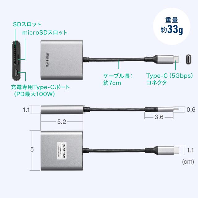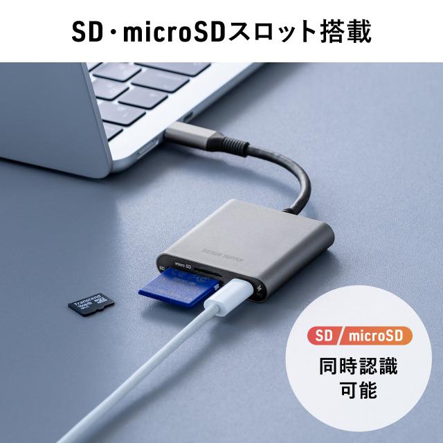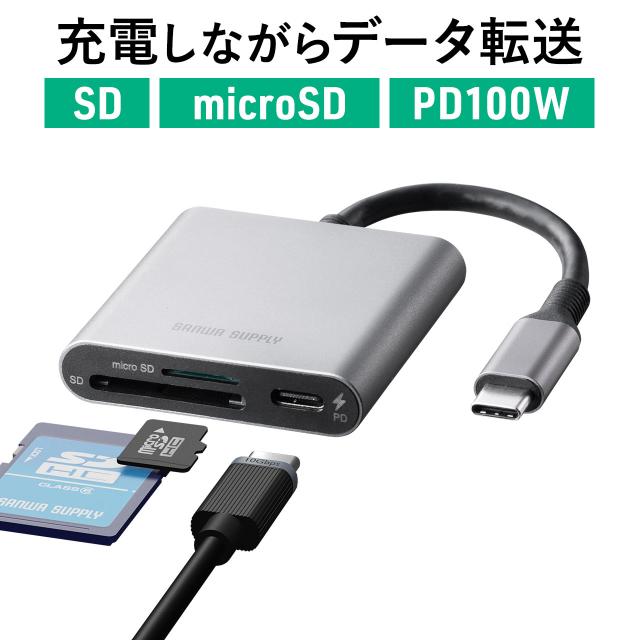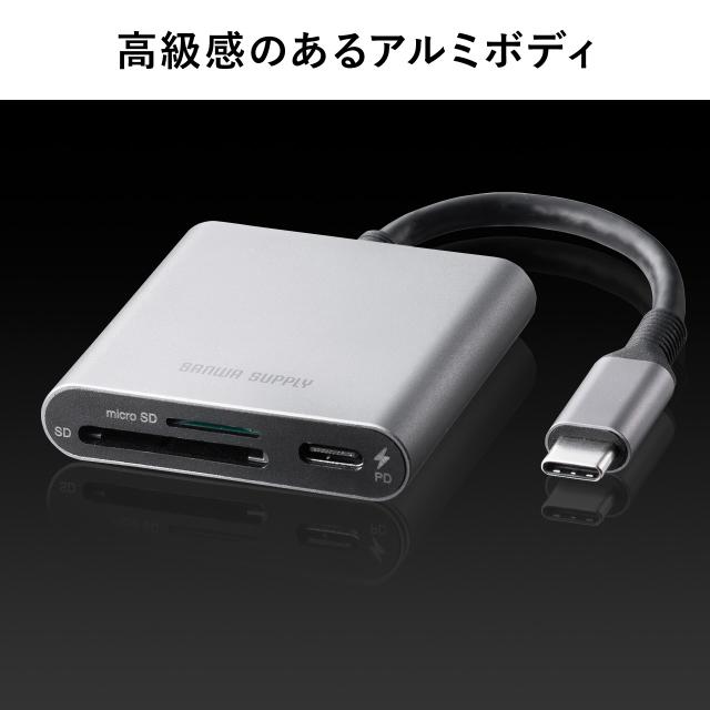 Type-Cカードリーダー PD100W対応 microSD SD UHS-I アルミ コンパクト iPhone15 iPad[400-ADR332GM]
