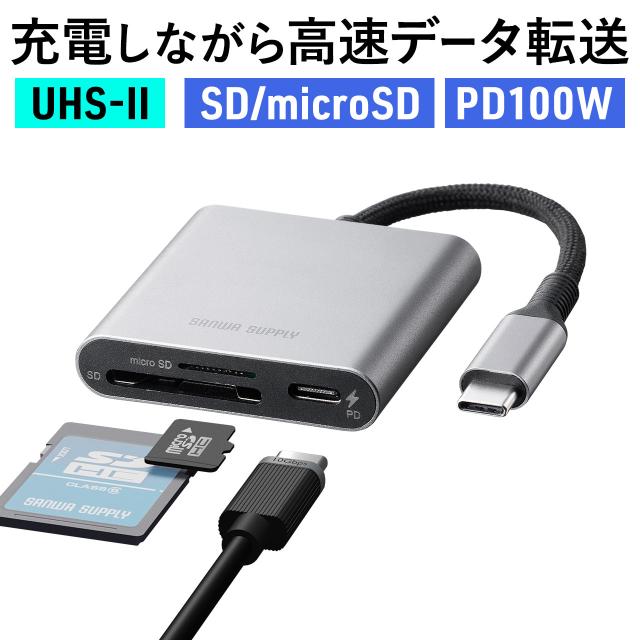 Type-Cカードリーダー PD100W対応 microSD SD UHS-II メッシュケーブル アルミ コンパクト iPhone15 iPad[400-ADR333GM]