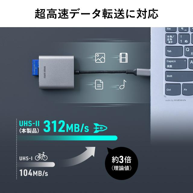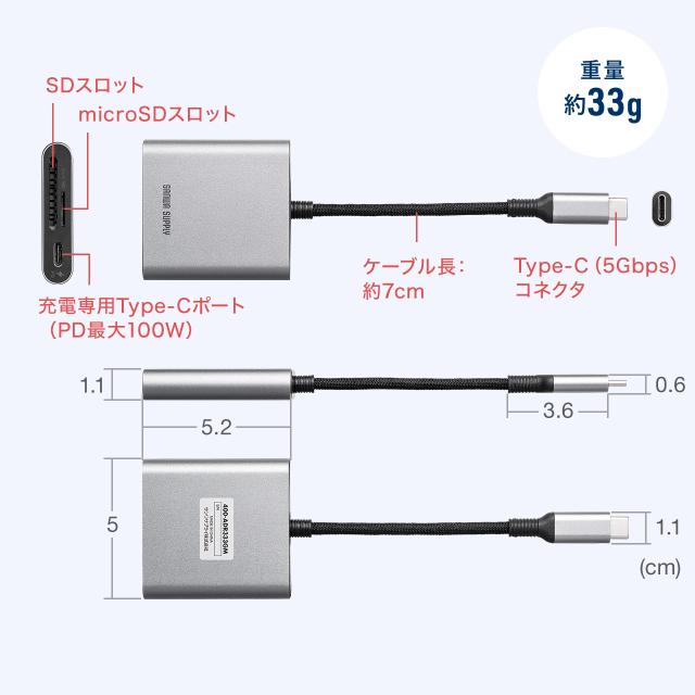 ●PD100Wで充電しながら使用できるType-Cカードリーダーです。●USB 5Gbpsのスーパースピードモード(5Gbps・規格値)に対応しています。