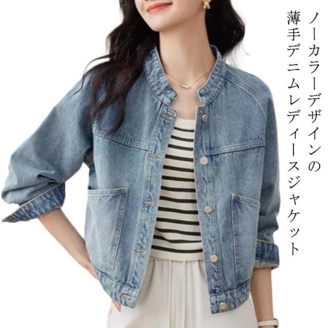 | ノーカラーデザインの薄手デニムレディースジャケット 素材はコットンを使用することで、柔らかく着心地も良いアイテムです。 丸首のノーカラーデザインで窮屈感なく、襟付きシャツやハイネックカットソーなどのトップスとも好相性。 ショート丈だからどんなボトムスとも好相性◎ お出かけの普段着としては街のおしゃれな景色になって、もちろん通勤通学などの場合でも生き生きとした雰囲気に漂っているアウターです。 | |