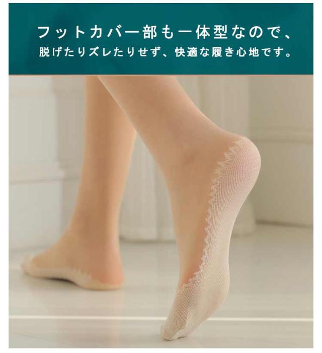 | シンプルながらも素肌感のあるストッキングです。 足の裏には綿が編み込まれていて、滑り止めがあります。 伸縮性があるので程よくフィットし、長時間の着用でも痛くないです。 通気性にも優れた素材を使用し、快適さも体感いただけます。 フットカバー部も一体型なので、脱げたりズレたりせず、快適な履き心地です。 パンツの裾からチラリと見える足元をキレイに演出してくれます。 | |