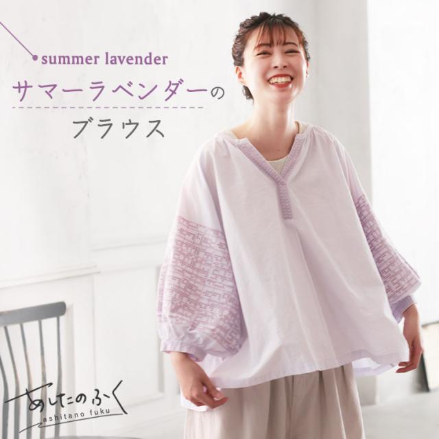あしたのふく サマーラベンダーのブラウス レディース プルオーバー 7分袖 バルーンスリーブ パフスリーブ コットン