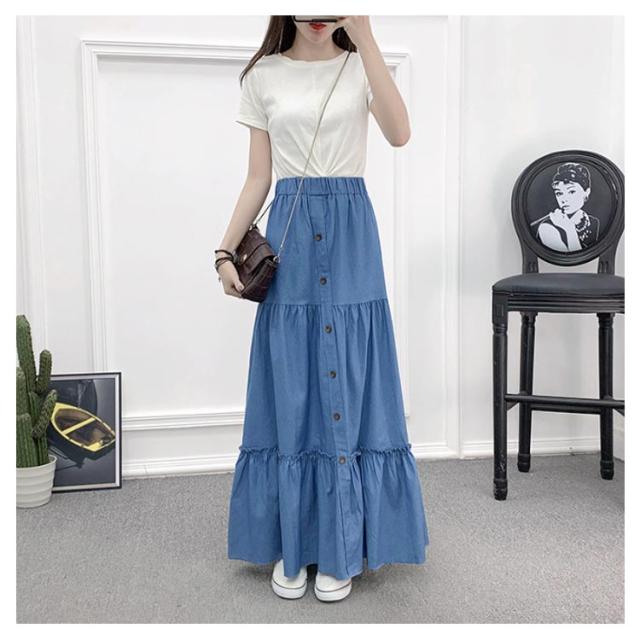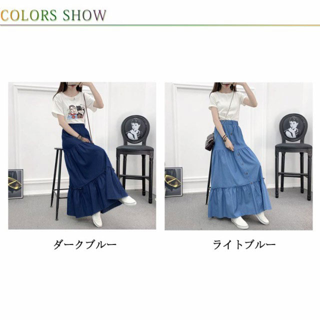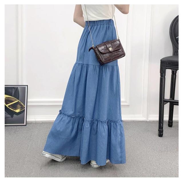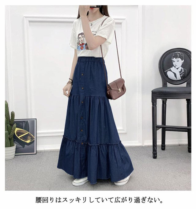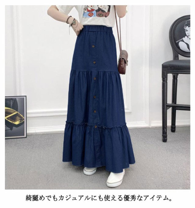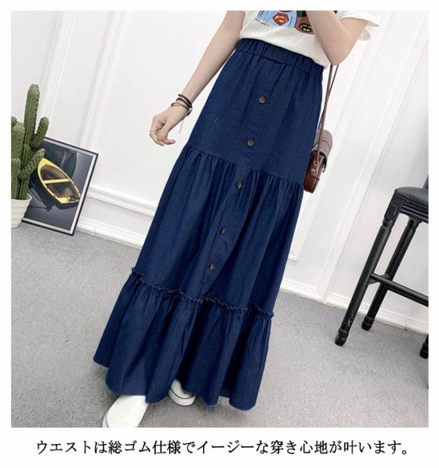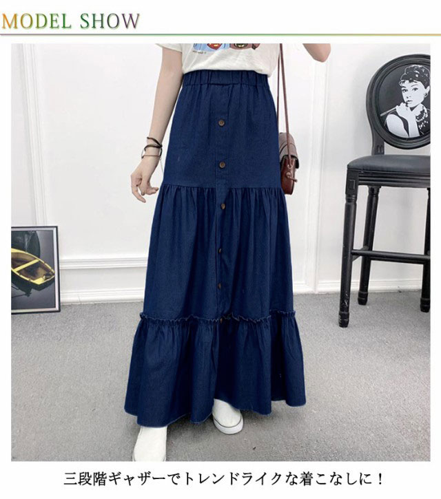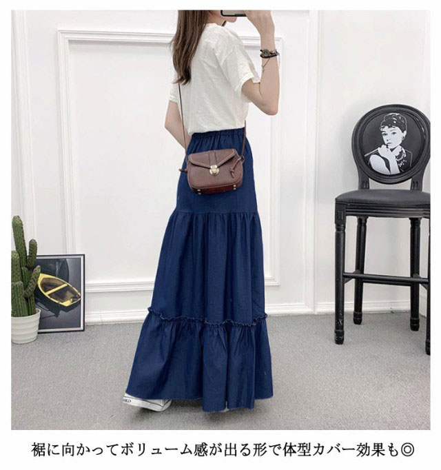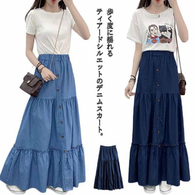 デニム フレアスカート デニム デニムスカート 切り替え ギャザースカート マキシ丈 ロングスカート マキシスカート レディース デニム ウエストゴム ティアードスカート カジュアル きれいめ 無地 大人可愛い 春 夏