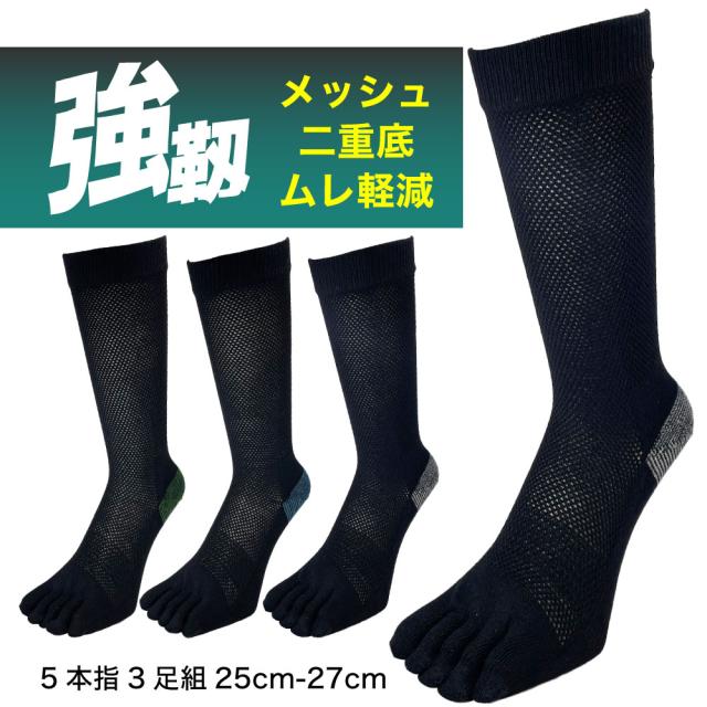 五本指ソックス メンズ 夏 強い 破れにくい 蒸れない 強靭 メッシュ 5本指 3足組 二重底 補強 安全靴 作業用 25-27cm