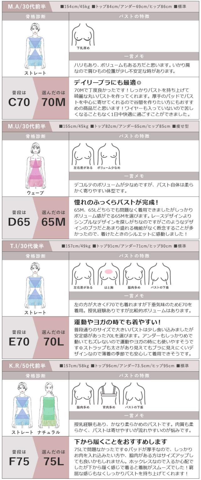 - 普段C80を着用しているので、80Mを購入しました。 生地がしっかりしているので、締め付け感があり、きつく感じましたが、本当に胸が盛れて谷間が出来る事に感動! 良い商品をありがとうございます。